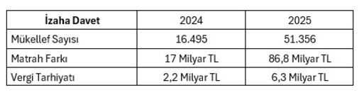 İzaha davet uygulaması tarafındaki artış oranları vergi incelemesini aratmayan nitelikte. 2024 yılı faaliyet raporu ile kıyaslandığında hem mükellef sayısında hem de bulunan vergi farkında 3 katın üzerinde artış oranı göze çarpıyor: