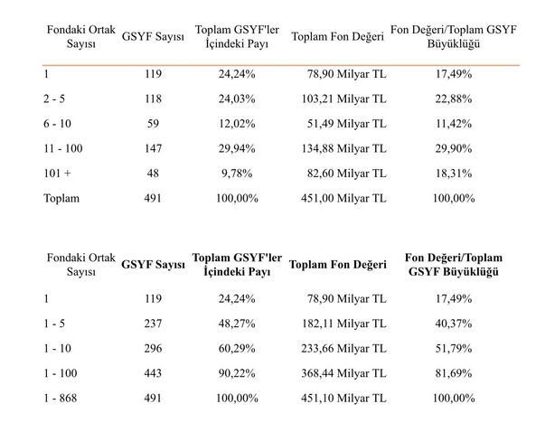 Tek Kişilik Fonlar: Toplam 491 fonun 119 tanesi (%24,24) sadece 1 ortaklı! Yani piyasadaki her 4 fondan biri aslında "kişiye veya kuruma özel” görünüm arz etmekte olup bu fonların toplam değeri yaklaşık 79 milyar TL.