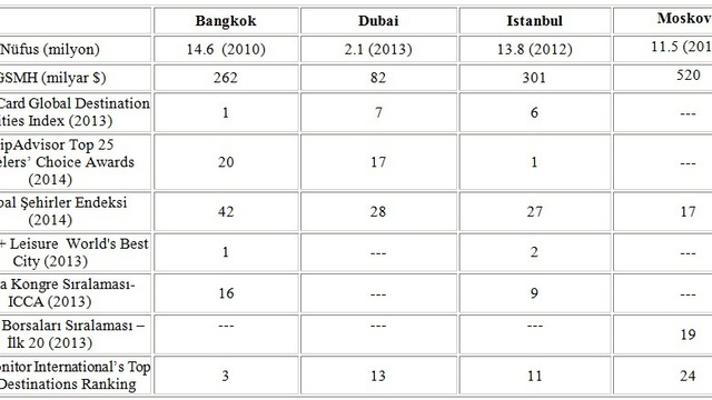 İstanbul, birçok sorununa rağmen gene de Türkiye’nin yıldızı, gururu. Paha biçilmez bir mücevher. Zaten bu sorunlar neredeyse bu dört şehrin hepsinde ve dünya metropollerinin büyük çoğunluğunda var. (Trafik, göç alma, hava kirliliği, diğer ekolojik problemler, güvenlik vs.) Bangkok’a 2, Dubai’ye 3, Moskova’ya 5 kez gitme şansım oldum. Zaten yaşadığım şehir de İstanbul. Böyle olunca, masa başı araştırmasından öte bireysel deneyimleme şansım da oldu. Belli başlı kriterlere göre bu dört şehri kıyasladım. Aslında bakılabilecek bir çok kriter var. İklim, Coğrafi Konum, Kültürel Miras, Global Kimlik ilk aklıma gelenler… Gene de ben popüler ve genel kabul görmüş bazı sıralamalara itibar ettim.