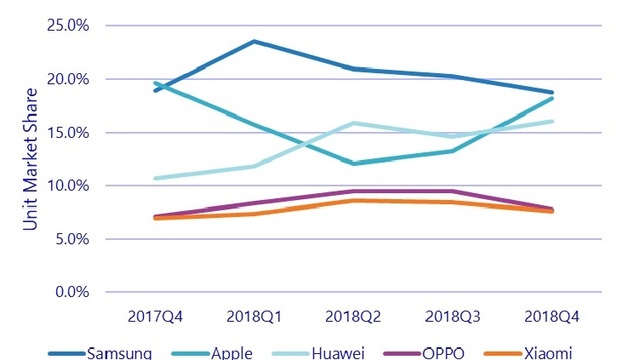 Yılın ilk çeyreğinde Samsung'un satışları 71,9 milyona, Apple'ın satışları 36,4 milyona geriledi, Huawei'nin satışlarıysa 59,1 milyona yükseldi.