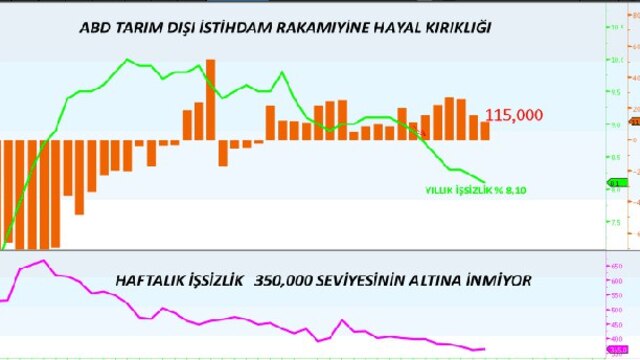 Ve haftanın son günü gelen tarım dışi istihdam verisi bir kez daha hayal kırıklığı yarattı. 160 bin kişi artış bekleniyordu ancak sadece 115 bin geldi. 2 aydır üst üste tarım dışı istihdam kötü geliyor ve Amerika ile ilgili olumlu beklentiler bozuluyor. Şirket bilançoları inadına beklenenden daha iyi gelirken, istihdam ve konut sektörü ABD'nin yarayan kanası durumda.