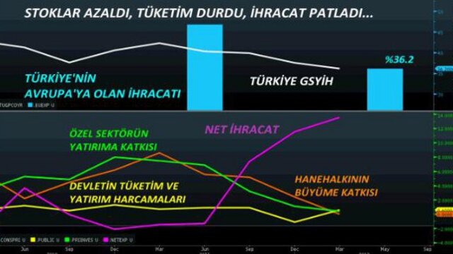 İlk çeyrekte genel resime baktığımızda talep unsuru olarak bakabileceğimiz hane halklarının tüketiminin %0 olması ve özel sektörün elindeki stok miktarında %2,3'lük azalma bize iç tüketimin zayıf, talebinde yetersiz olduğunu gösteriyor. Özellikle lüks tüketim mallarına talebin azalmış olması cari açık açısında pozitif bir gelişme. Demek ki TCMB'nin ekonominin yumuşak inişi için oluşturduğu sıkı para politikası işe yaramış.