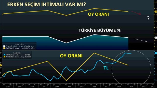 Türkiye'nin büyüme rakamlarıyla düşük büyüme - düşük oy, yüksek büyüme - yüksek oy gibi bir doğru orantı söz konusu. 2013 yılı büyüme rakamı yüzde 4 geldi. Bu sene yani seçim yapılacak yılda ise büyümenin yaklaşık yüzde 2 civarında olması bekleniyor. Oy oranı da aynı şekilde çalışacak olur ise siyasi uzmanlar oy oranının yüzde 45'lerden aşağı gelme ihtimalinin söz konusu olduğunu belirtiyorlar. Bunu bir soru işareti olarak buraya koyalım.