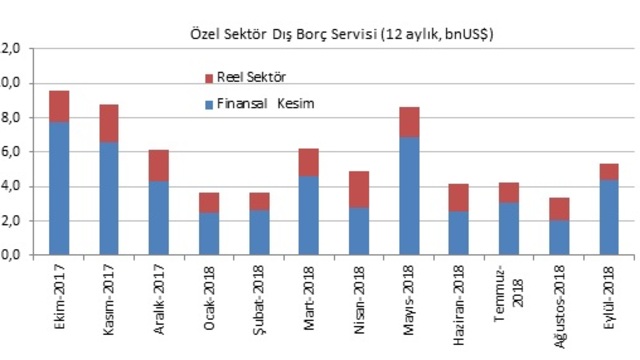 Özel sektörün (banka+bankadışı) önümüzdeki 12 aylık vadede yaklaşık 68 mlr dolar dış borç ödemesi var. Bunun 17 mlr doları kısa vadeli, 52 mlr doları da uzun vadeli borcun önümüzdeki 12 aya düşen servisidir. Yani aylık ortalama 5.5-6 mlr dolara yakın özel sektör döviz ödemesi bulunmaktadır. Bunların en yoğun olduğu aylar Kas17, Ara17 ve May18’dir.