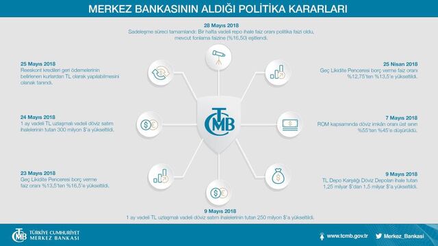Nisan dahil toplamda 375 baz puan faiz artışı. Ardından da Geç Likidite Penceresi'nin yerine yeniden haftalık fonlamanın %16.50 ile politika faizi olması. Ek olarak simetrik ve görece dar bir koridor uygulması da var. Buna göre; TCMB gecelik vadede borçlanma ve borç verme oranları bir hafta vadeli repo ihale faiz oranına (%16.50) kıyasla -/+ 150 baz puanlık bir marj ile belirlenecek. Böylece borçlanma faizi %15, borç verme faizi de gecelik %18’de oluşacak. GLP’de %19.50. Ortalama fonlamanın da %16.50 çevresinde dalgalanması sağlanacak.
