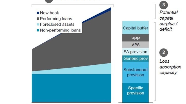 Çok fazla Türkçe’ye çevirmeye gerek olmadan başlıklar halinde aktaralım. Bankaların gayrimenkul cephesinde sahip oldukları zararları ve kredi portföylerinde taşıdıkları olası + şu an perfomans gösteren ancak ilerleyen zamanlarda takibe düşebilecek kredi zararlarını eksi hanesine yazıyoruz. Böylece zararın nereden ve ne büyüklükte gelebileceğini hesaplıyoruz. Kötümser senaryoda bu zararların toplamı 270 milyar euroyu buluyor. Zararların % 57’sinin ise uzun süredir tartışılıan gayrimenkul sektöründen geldiğini not edelim. Denklemin sağ tarafında, yani gelir yaratan bölümde ise çeşitli maddeler görüyorsunuz. Onları şöyle okumak mümkün: