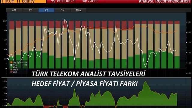 Şirketin 3. Çeyrekte 644 milyon TL net kar elde etmesi beklenirken aşağıdaki grafikte şirket üstüne tavsiye veren analistlerin oluşturduğu beklentiler görülebilir. Buna gore, 31 analistin 8’i (yeşille görülen) ‘al’ tavsiyesinde bulunuyor. 21 analist ‘tut’ önerisinde bulunurken 2 analist ise ‘sat’ tavsiyesi veriyor. Analistlerin ortalama 12 aylık hedef fiyatları 8.06’da oluşurken hissenin son fiyatı 7.08’de. Bu durumda, ortalama analist beklentilerine göre Türk Telekom’un % 15’lik değerlenme potansiyeli bulunuyor. Grafiğin alt panelinde bulunan fark ise tavsiye edilen fiyat ve hisse fiyatı arasındaki makası gösteriyor.