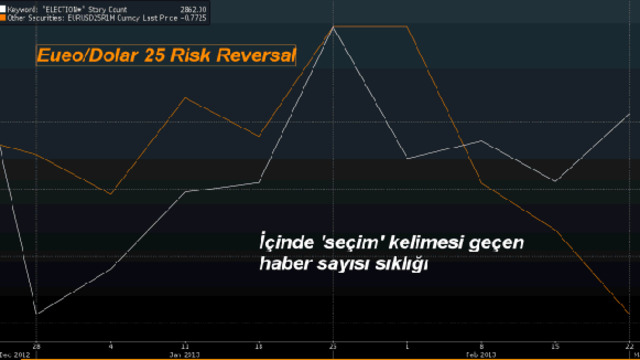 Aşağıda seçim konuşuldukça Euro/Dolar’da oynaklığın nasıl arttığına dair bir de grafik var. Kısaca tarif etmek gerekirse, seçim konuşuldukça satım opsiyonları istikrar kazanıyor ve pariteye o yöne gidiyor demek doğru olabilir. Sonuç olarak, ne kadar seçim o kadar oynaklık…