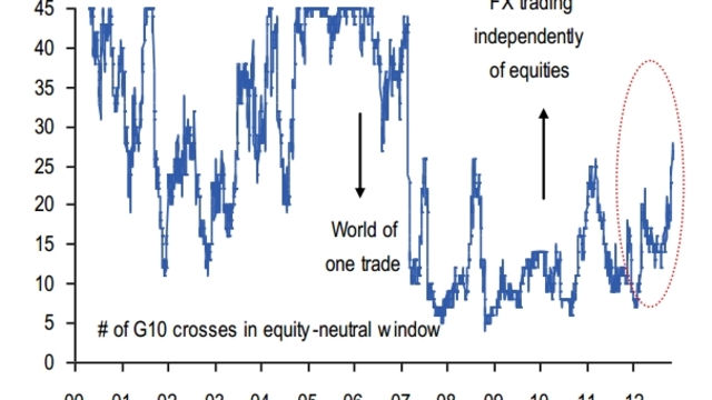Diğer grafik ise G10 ülkeleri için kurlar ve hisse senetleri arasındaki korelasyonu gösteriyor. İlişki krizde sürekli sekteye uğramış ancak hisse senetleri performansı ve kur getirileri arasındaki korelasyon hiç bu kadar zayıf olmadı.