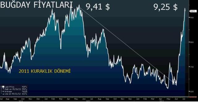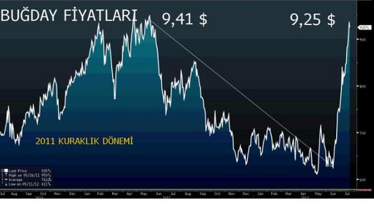 Özellikle İslam dünyası* için en büyük nimetin hammaddelerinden biri olan buğday ise henüz rekor kırmadı, ama son beş haftada yüzde 50 değer kazandı. Buğdayın buşeli 2011 Mayıs ayında 941 sent ile rekor kırdıktan sonra 600 sente kadar geriledi. Fakat dünyanın en büyük dördüncü buğday üreticisindeki arz sıkıntısı sebebi ile buğdayın kilesi CBT'de TSİ 14.37'de eylül vadeli buğday kontratı 925 sentten alıcı buldu.