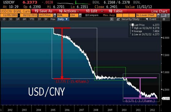 Grafikte de görüldüğü üzere yuan 2005 - 2008 döneminde dolar karşısında yüzde 17 değer kazanıyor. Lehman Brothers çöküşü ile başlayan kriz ile birlikte ise Çin kuru sabitliyor. fakat 2010'un altıncı ayından itibaren ABD'nin bastırması ile ikinci değer kazanma süreci başlıyor ve yuan dolar karşısında yüzde 9 yol kat ediyor.