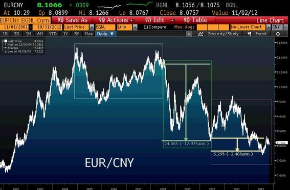 Euro Bölgesine geldiğimizde ise süreç dolar ile aynı doğrultuda ilerlemiyor. 2005 - 2008 döneminde fazla bir değerlenme olmadığı için Çin rahat mal satıyor. 2008 - 2010 arasında ise yuan euro karşısında yüzde 25 değer kazanıyor. 2010 hazirandan bu yana ise yüzde 5 ile pek bir değişim göstermiyor.