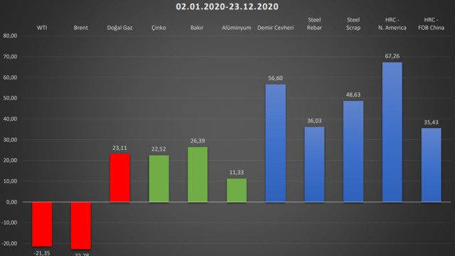 Yıl sonu itibarıyla geldiğimiz noktada petrol ve metallerdeki geri dönüş çok dikkat çekici. Petrol dışındaki tüm ürünler yılı pozitif kapatmanın yanı sıra son yıllardaki en yüksek seviyelerinde tamamlayacaklar. Yıl başından bu yana HRC çelik %67, demir cevheri %57, hurda %49, inşaat demiri %36 ve bakır %26 fiyat artışı yaşadı.