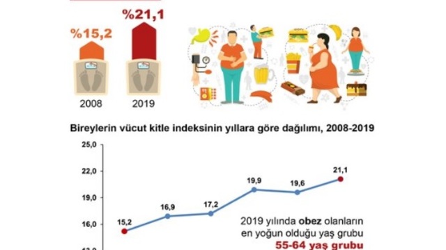 Türkiye’deki obezite oranı 11 yılda yüzde 38,9 oranında arttı. 15 yaş ve üstü obez bireylerin oranı 2016 yılında yüzde19,6 iken, 2019 yılında yüzde 21,1 oldu. Obezite oranı 2008 yılında yüzde 15,2 iken 2019 yılında yüzde 38,9 oranında artış göstererek yüzde 21,1’e ulaştı. 2019 yılında obez olanların en yoğun olduğu yaş grubu 55-64 yaş grubu olduğu görüldü. 2019 yılında kadınların yüzde 24,8'inin, erkeklerin ise yüzde 17,3'ünün obez olduğu görüldü.