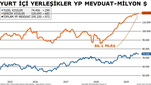 Merkez Bankası tarafından Perşembe günü yayınlanan haftalık bilgilere göre yurt içi yerleşiklerin döviz mevduatı aynı dönemde altın hariç 635 milyon dolar arttı.