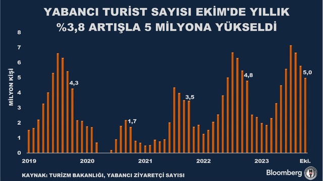 Kültür ve Turizm Bakanlığı'nın verilerine göre, Türkiye'yi tercih eden toplam ziyaretçi sayısı yılın 10 ayında 50 milyon 217 bin kişi oldu. Turizmde yıl sonu hedefi 60 milyon turist. Ekim ayında ziyaret eden yabancı sayısı ise geçen yılın aynı ayına göre yüzde 3,83 artarak 4 milyon 987 bin 112'ye ulaştı.